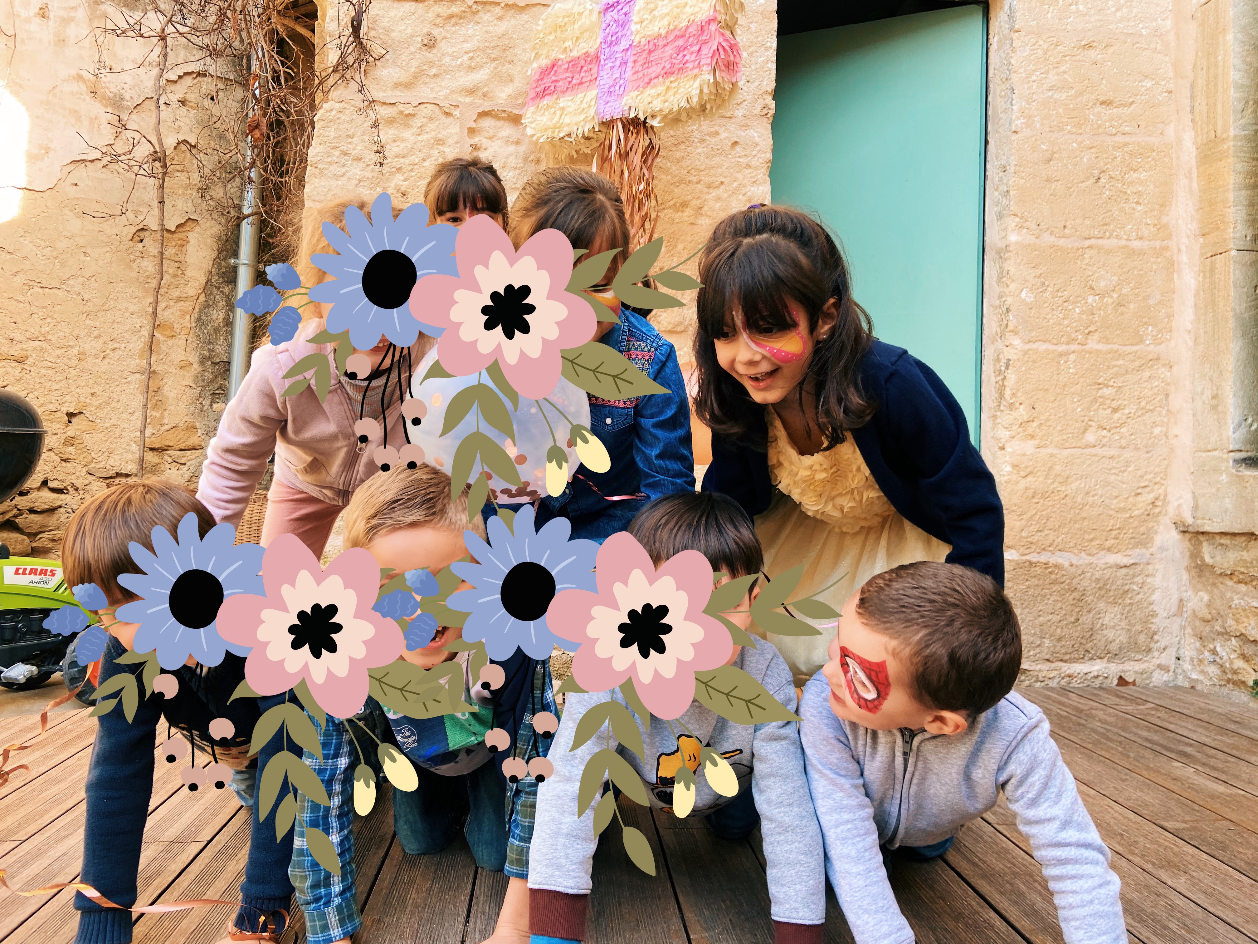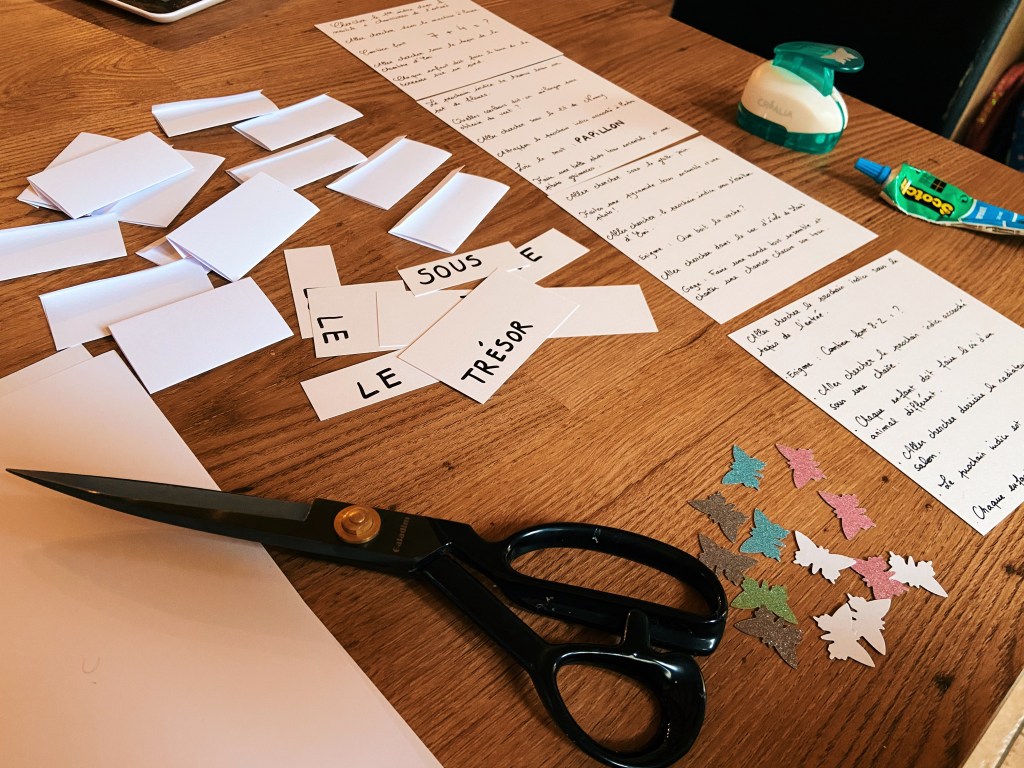 Je me suis également penchée sur la chasse aux trésors. J’ai fait simple et ça n’a pas du tout empêcher de plaire, bien au contraire. J’ai donc fait des indices sous forme de petits papiers à aller chercher aux quatre coins de la maison, et j’ai aussi fait une partie « gages » et « énigmes » qui donnaient le droit à des indices également. Le but des gages étaient de faire des actions tous ensemble (par exemple : faire une pyramide tous ensemble, faire le tour de la cour à cloche-pied, au tour de chacun de faire le cri d’un animal différent, etc…) ça leur permet de jouer ensemble à contrario de la recherche d’indices qu’ils considèrent plus comme de la compétition. Et enfin les énigmes, j’ai fait relativement simple pour garder un rythme dans le jeu comme par exemple : « Que boit la vache ? », « Combien font 8 – 4 = ? » ou alors « Quelles couleurs doit-on mélanger pour obtenir du vert ? » Le dernier indice était sous forme de 7 petits papiers (nombre d’enfant) avec un mot écrit pour chacun et chacun devait lire son mot pour comprendre la phrase qui indiquait l’endroit du trésor (LE – TRÉSOR – EST – SOUS – LE LIT – DE – TOM), ils ont trouvé et ont ramené le trésor fièrement ahah !