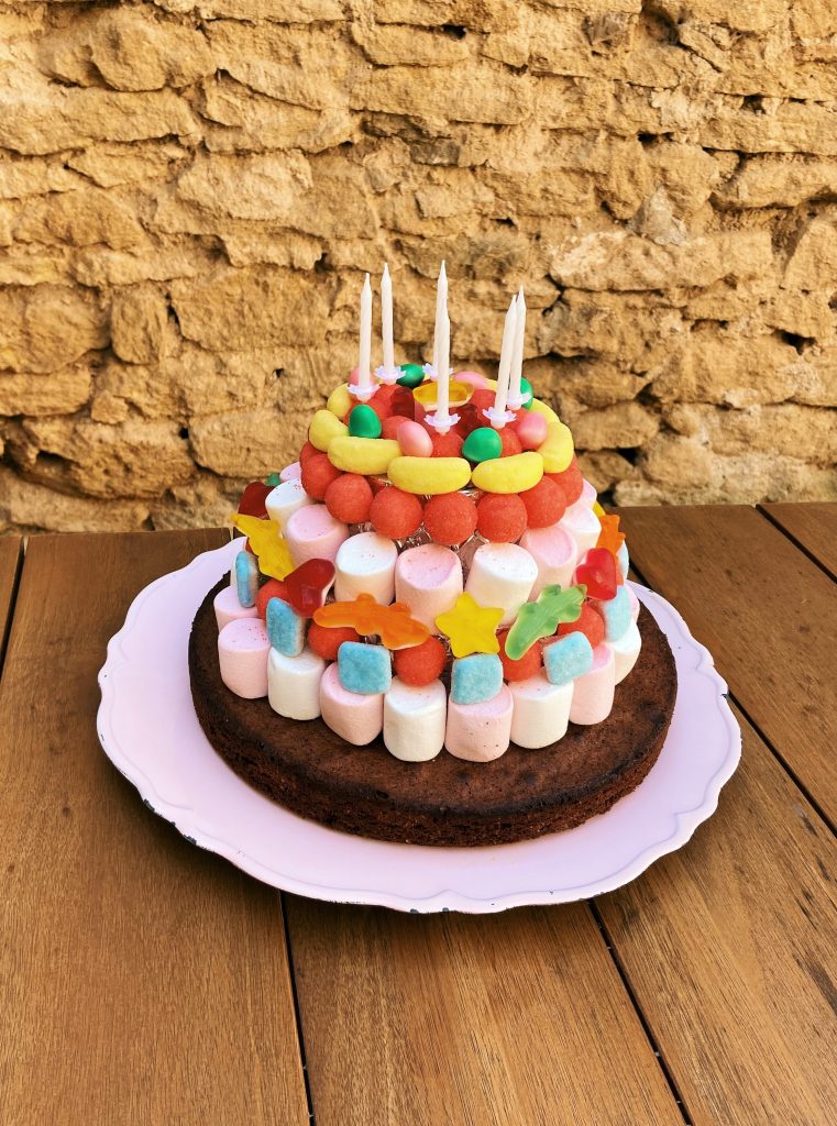 Le principe est simple : On achète des morceaux de polystyrène ronds et plats de différents diamètres, que l’on enveloppe de papier aluminium (moi je le colle carrément le papier alu dessus pour que ça ne bouge pas), puis on les colle entre eux du plus gros au plus petit pour donner la forme d’un gâteau. Ensuite on y insère les bonbons grâce aux cure-dents (personnellement je pique d’abord le cure-dent et après je pique le bonbon), et le tour est joué ! Ici, la dernière couche du bas est un vrai gâteau au chocolat.
