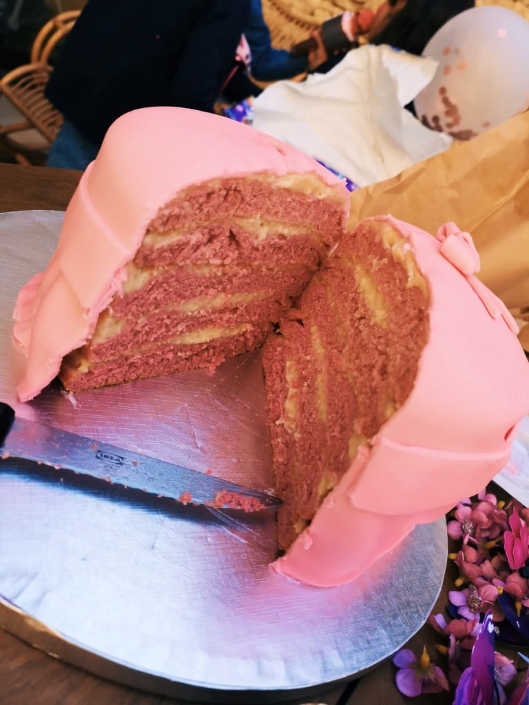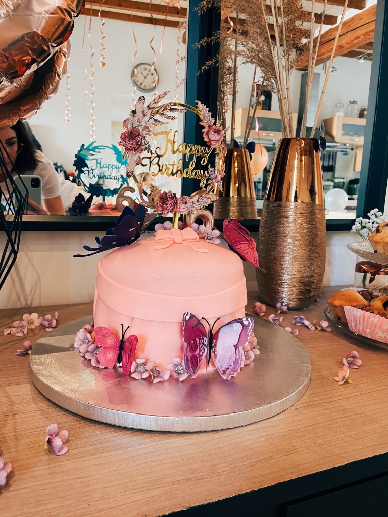 Puis étaler de la crème entre chaque étage du gâteau, et napper le restant tout autour. Planter 3 pics à brochettes sur toute la hauteur du gâteau pour que toutes les couches se tiennent bien (couper le pic si trop grand), puis recouvrir le tout d’une pâte à sucre, tout en travaillant bien la pâte autour afin d’éviter les plis. Décorer enfin de diverses petites déco, bougies, etc… (Ici j’avais acheté des papillons comme elle avait choisi ce thème-là) Et le tour est joué ! N’hésitez pas à me faire un retour pour me dire si vous essayez ! ❤️