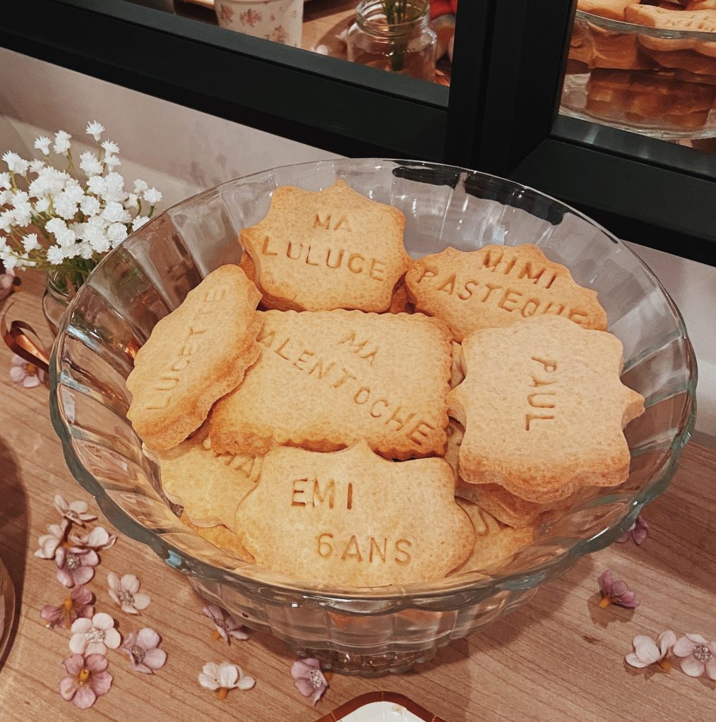 J’ai fait la pâte à biscuits vanille, et munie de mes plus beaux emporte-pièces ainsi que mes petites lettres, j’ai passé l’après-midi à écrire sur les biscuits les prénoms et petits surnoms rigolos pour les faire rire.
