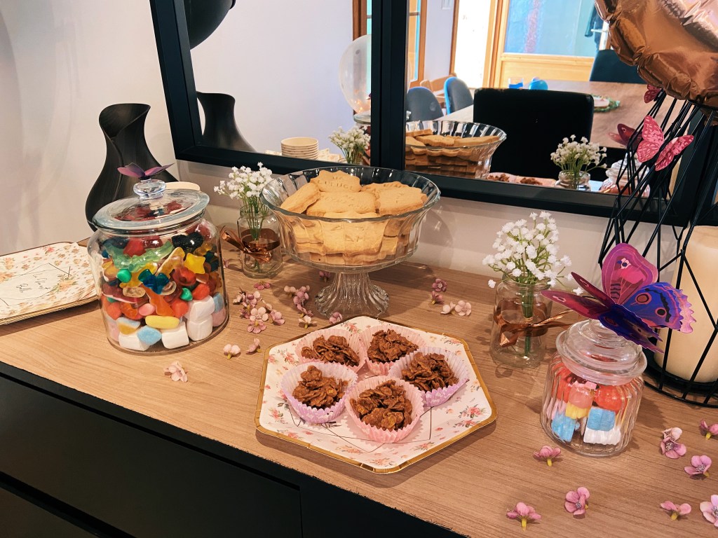 Ensuite la veille, j’ai entamé la pâtisserie. J’ai été obligée de m’y prendre à l’avance parce que je n’avais pas assez de temps le jour J (avec 3 enfants + la mise en place de toute la déco c’était beaucoup trop short niveau timming).