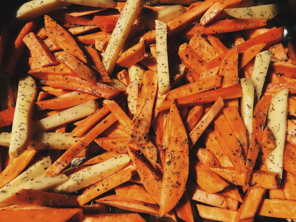1)- On préchauffe le four à 180°. 2)- On épluche tous les légumes, on les coupe en forme de frites, puis on met le tout dans un grand plat. 3)- Dans un petit bocal prépare son petit mélange « huile-sirop d’érable », on mélange bien le tout et on verse les 2/3 sur les frites. (On réserve un tiers du mélange pour après). Puis on saupoudre d’herbes de Provence, sel et poivre. 4)- On mélange bien le tout pour que toutes les frites soient bien recouvertes, puis on met le tout 30min au four à 180°. 5)- Au bout de 30min : on re-mélange le tout, et on remet à cuire 15min. 6)- Une fois les frites cuites, on verse la fin du mélange huile-sirop d’érable dessus, on mélange encore une fois et on laisse une dernière fois 5min au four. Et vous pouvez servir !