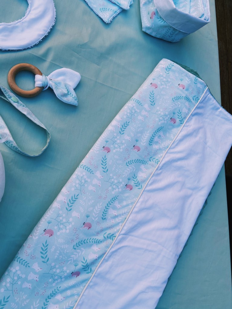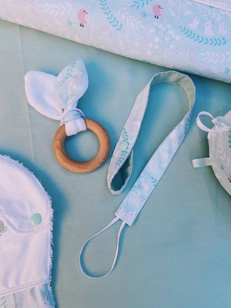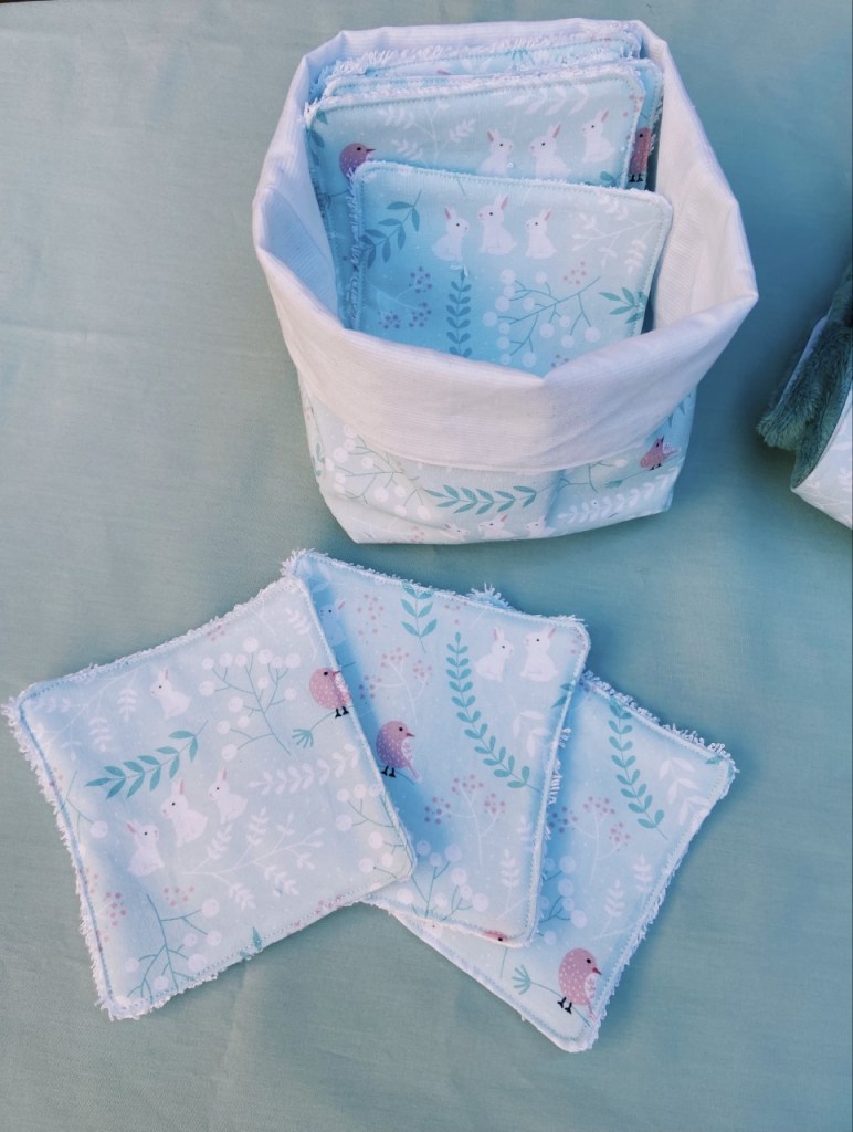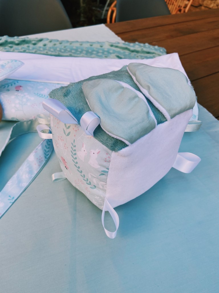 J’ai adoré ce tissus vert d’eau avec des petits lapins. Et c’est drôle parce que ce coffret était justement destiné à un collège, aux couleurs de nos blouses de la réa med 🙃!