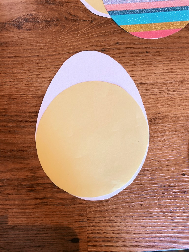 2)- Après l’avoir imprimé (ou pas, vous pouvez très bien dessiner un un œuf directement sur la feuille), il vous faut reporter le modèle de l’œuf sur du papier blanc épais : 2 fois, et le poussin (un simple rond) sur une feuille jaune : 1 fois. 3)- Ensuite on va s’occuper de la coquille (à l’avant), on la décore avec du masking tape comme on le souhaite.