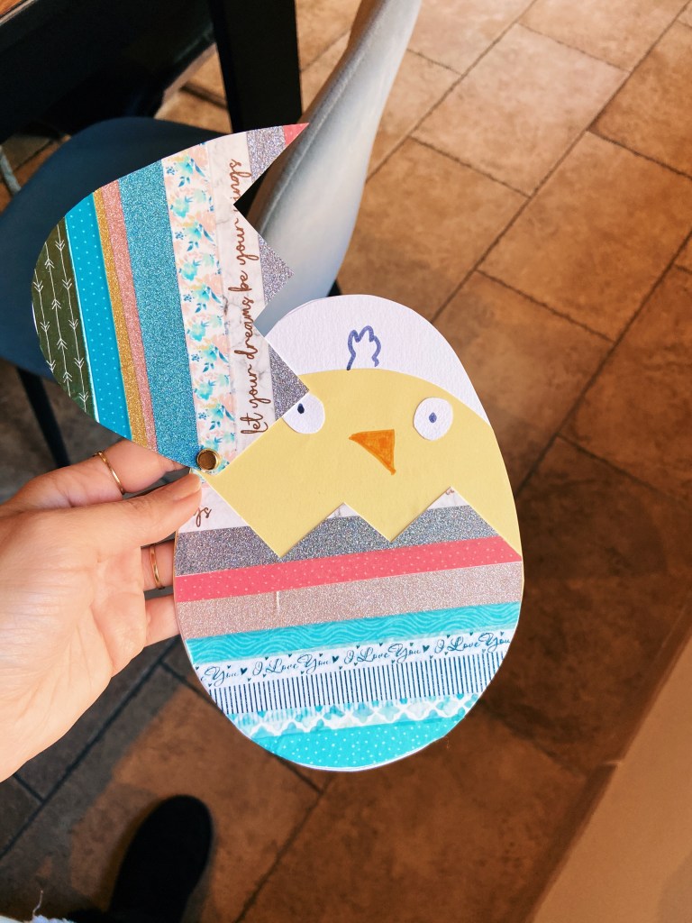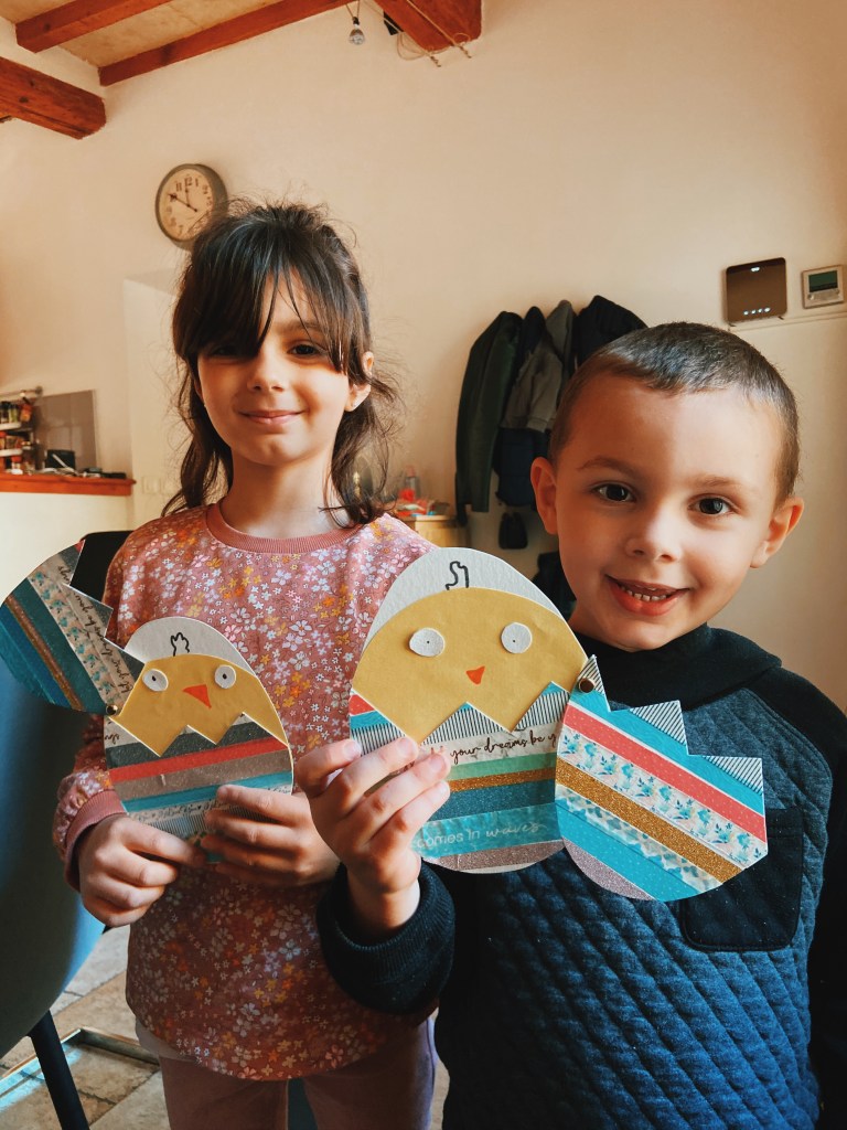 On profite toujours des vacances scolaires pour faire des petites activités manuelles en thème avec la période (ici Pâques, le printemps, etc…). Aujourd’hui c’était confection d’un poussin dans sa coquille qui s’ouvre et se ferme grâce à une attache parisienne.