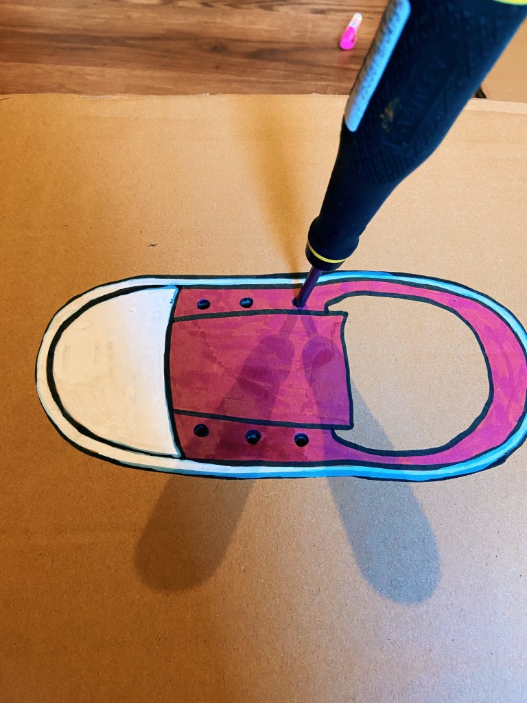 • 1 morceau de carton chacun • Quelques feutres (+1 Posca blanc) • 1 tournevis (ou n’importe quoi d’autre qui peut servir à faire un trou dans le carton) • Des lacets