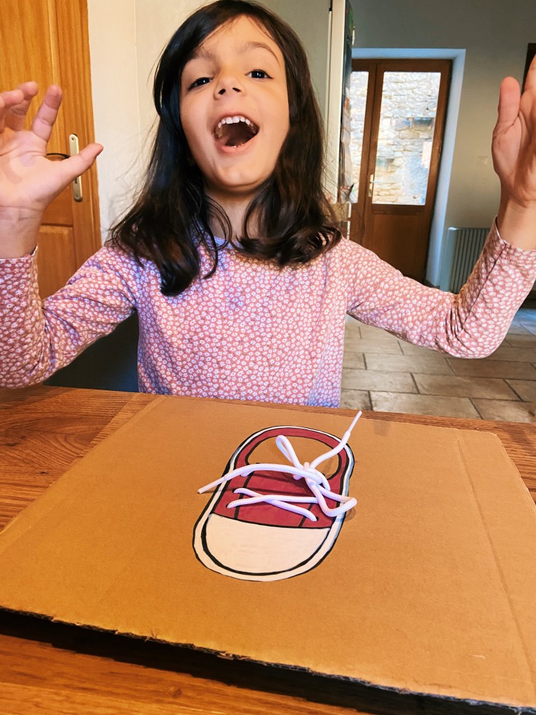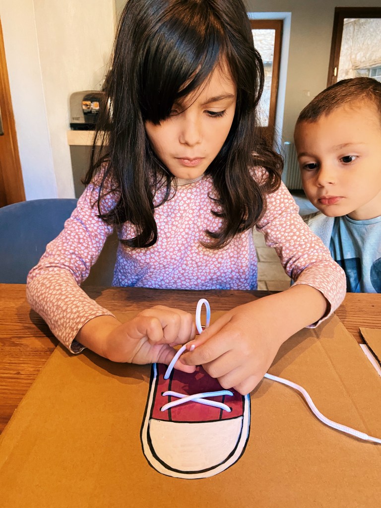Résultat : Emi sait enfin faire ses lacets ! 🥳👏🏻 Loulou n’a pas eu assez de patience pour atteindre l’objectif mais il a quand même essayé 😊, avec l’entraînement ça viendra… !