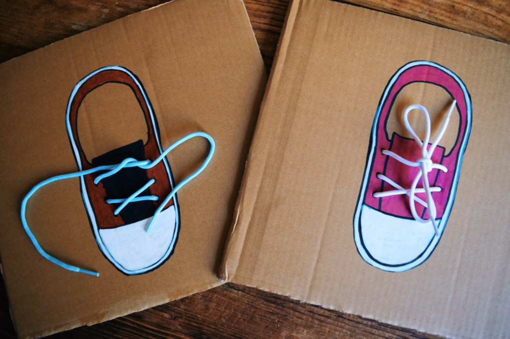 C’est une activité ludique, où l’enfant s’amuse à confectionner sa propre « chaussure ». Cet outil s’avère pratique car l’enfant peut s’entraîner sans se salir. On emploie ce type de support dans la pédagogie Montessori.